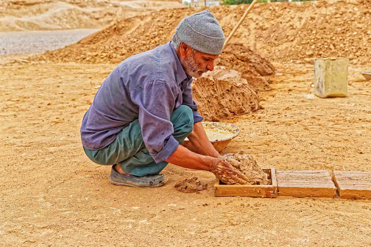 Adobe construction has been practiced as far back as 6000 B.C. Three of the same basic materials are used as with cob (clay, sand and water)  except the fourth fibrous material is only used sometimes. Once mixed, the adobe mixture is  left to dry in forms until they become hardened bricks, which are then laid by masons. In locations where a building will be subject to harsh, wet weather, adobe is sometimes stabilized with a bit of cement or asphalt emulsion to keep it held together.
